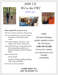 Our goal is to promote friendship and the sharing of common interests and activities across the University community. Whether you are new to the U-M community or have lived here for some time, we encourage you to explore our 40+ interest sections, where we promise you will find something of interest, and, if not, join us and start a new section!